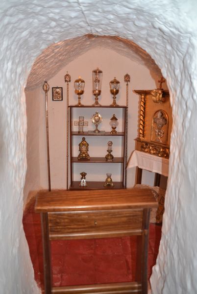 Tout autour de nous apparaissent ces maisons troglodytes désormais équipées d'eau et d'électricité. Mais ce ne fut pas toujours le cas. Je découvrirai plus tard une photographie de Jesus Valverde, datant de 1930, ci-dessous en photo, qui montre des grottes nettement plus rudimentaires. Il faut savoir que Guadix reste la capitale européenne des grottes habitées avec près de 3000 d'entre elles. En réalité, ce nombre correspond aux grottes transformées en maisons troglodytes, car le nombre total de grottes, tout autour est bien supérieur. Il faut savoir que cet habitat troglodytique (c'est le nom savant donné à l'architecture consistant à aménager des habitats souterrains ou creusés dans le rocher à flanc de montagne) existe depuis la Préhistoire. Ces maisons sont souvent creusées dans des roches sédimentaires (calcaires, mollasse, grès, tuf, loess...) ou volcaniques et sous tous les climats. A Guadix, il s'agit de roche calcaire, celle-ci même qui provient des collines entourant la ville. Pourquoi Troglodytes ? Cela vient du peuple antique des Troglodytes qui vivait en Egypte, à proximité de la mer Rouge, et s'était installé dans les anfractuosités des rochers. Il faut ensuite se poser la question de savoir pourquoi ce choix. N'oublions pas que les grottes furent les premiers habitats pour les premiers hommes. En ce qui concerne les grottes de Guadix, leur origine remonte à la Reconquête de l'Espagne par les rois catholiques. Les Mauresques durent fuir à l'arrivée des Chrétiens et se regroupèrent dans ces grottes, situées à l'écart de la ville. Il faudra attendre le XVII ème siècle pour que ce genre d'habitat commence à être reconnu comme tel. Le sous-sol est particulièrement protecteur et isole du brouhaha extérieur. Une récente étude montre que les habitants de maisons troglodytes vivent mieux que les autres, bien à l'abri dans leur logis et relativement à l'abri des mauvaises ondes. Dans un tel logis, pas besoin de climatiseur, ni de chauffage : une température constante de 20°C règne toute l'année, dispensant aux organismes humains les grands écarts thermiques, jamais bons pour la santé. En France aussi, nous disposons de tels habitats : au début du XX ème siècle, on évaluait à 25000 le nombre d'habitants de maisons troglodytiques. Généralement, une cheminée correspond à une maison. Cette cheminée-là ne sert pas à faire du feu mais simplement à évacuer les odeurs de cuisine. Il est d'ailleurs interdit aux occupants de cuisiner au gaz, et ce, par mesure de sécurité, mais l'usage banalisé de l'électricité permet aujourd'hui de faire aisément face à ce genre de contraintes. José, un habitant du quartier, nous ouvre ses portes : sa maison est entièrement souterraine, avec ses deux chambres (ci-dessous), sa cuisine (qui offre l'une des seules fenêtres de l'habitation), et sa salle à manger. La lumière n'a que peu de points d'entrée, ce qui explique que ce genre de maison est parfois équipée d'une porte à deux battants, pour permettre de laisser entrer la lumière par sa partie supérieure. Chez José, la température est fort agréable et contraste avec le froid extérieur. José dispose bien sûr d'une télévision et a tiré un câble au dehors afin de le relier à l'antenne TV perchée au-dessus. D'où ces câbles et ces antennes Tv qui apparaissent souvent au-dessus de l 'Alcazaba (forteresse de Guadix).
