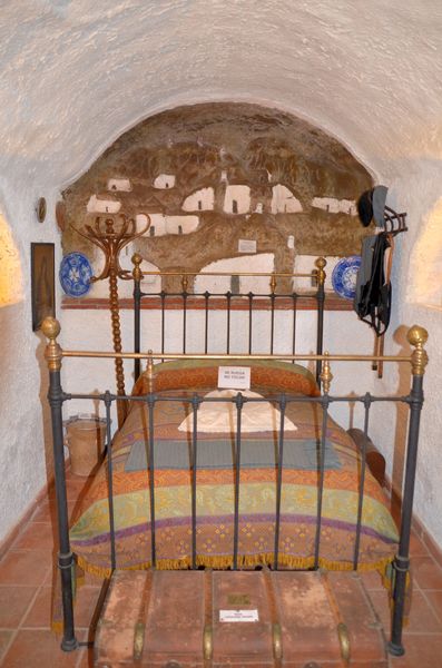 Après ma pause déjeuner, je me rends au Musée Alcazaba, qui est consacré à la céramique et à la poterie (ci-dessous). Là encore, ce musée est réfugié dans une grotte creusée sous l'Alcazaba (d'où son nom!). Il a été inauguré en 1998 et la même famille, celle du céramiste Juan Manuel Gabarron, se relaie depuis pour accueillir les visiteurs. La visite me permet d'admirer des poteries, des céramiques (le musée en possède 1500) mais également des sculptures réalisées directement dans la roche souterraine, sculptures qui représentent différents symboles culturels de Guadix, depuis l'an 300 avant J.C jusqu'à nos jours. J'observe enfin des pièces reconstituées comme cette petite chambre (deuxième photo) aménagée dans une grotte.