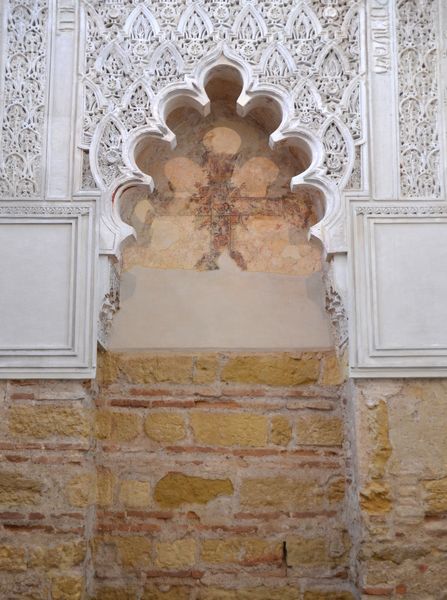 Dans le quartier juif, la Juderia, je m'arrête quelques instants pour visiter la Synagogue, librement accessible. Edifiée vers 1315 par Alarife Moheb, elle demeure l'une des trois seules synagogues du Moyen âge qui subsistent en Espagne. L'intérieur de ce cet édifice de style mudéjar est orné d'inscriptions hébraïques et de magnifiques stucs (ci-dessous). Située à moins de 200 mètres de la Mosquée-Cathédrale, c'est aussi l'unique synagogue existant en Andalousie. Après l'expulsion des Juifs en 1492, l'endroit devint un hôpital, puis, en 1588, le lieu de vénération de San Crispin et San Crispiniano, les saints patrons des cordonniers. Elle sera même utilisée comme école. En 1884, alors que des réparations étaient réalisées à l 'intérieur du bâtiment, on découvrit des traces d'écriture hébraïque, ce qui permit, l'année suivante, son classement en tant que bien culturel. L'édifice fut ensuite restauré à plusieurs reprises, grâce, entre autre, à l'architecte Don Felix Hernandez (en 1928), jusqu'à sa réouverture au public en 1985, à l'occasion du 850 ème anniversaire de la naissance de Maimonides, rabbin et théologien juif d’Al-Andalous du Moyen âge.