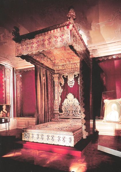 Juste à côté de cette salle, on traverse la salle riche, riche du seul lit d'apparat (ci-dessous) de la cour de Vienne qui soit encore conservé. Il fut fabriqué au moment du mariage de Marie-Thérèse et était, à l'origine, situé dans les appartements privés de l'impératrice, au Palais impérial de Vienne, à la Hofburg. En velours rouge brodé d'or et d'argent, ce lit imposant possède des panneaux architecturaux imitant la broderie. Impressionnant ! Le bureau de François-Charles se trouve quant à lui dans une pièce qui appartenait au XIXè siècle au père de François-Joseph, l'archiduc François-Charles. On peut y admirer de nombreux tableaux, dont celui de la famille de l'empereur François de Lorraine et Marie-Thérèse, entourés de leurs...seize enfants (dont onze atteindront l'âge adulte). La dernière salle représente la salle de chasse, et montre la passion entretenue par les Habsbourg pour ce sport.