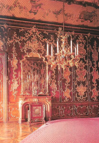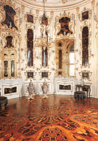 Quant à la petite galerie (parallèle à la grande), elle donne sur les jardins du château. Elle était utilisée pour célébrer en famille fêtes et anniversaires. De chaque côté de cette petite galerie, on peut admirer deux cabinets chinois, un rond (deuxième photo ci-dessous) et un ovale. Marie-Thérèse avait en effet une prédilection pour les arts chinois et japonais, en vogue à cette époque. On trouve dans chaque cabinet des panneaux précieux de laque chinois, incrustés dans les lambris de bois blanc, et dont les cadres dorés se prolongent pour former des consoles, ornées de porcelaine bleue et blanche. Les parquets sont réalisés en marqueterie. Ces cabinets servaient tantôt de salons de jeux, tantôt de salons de consultation. C'est dans le cabinet rond que se tenaient les entrevues et les consultations secrètes de Marie-Thérèse avec son chancelier d'Etat, le Prince Kaunitz.