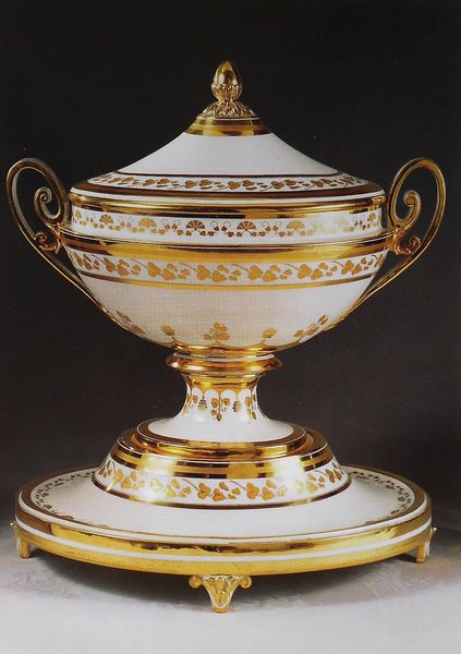 Autre manufacture, autre service. Le service de table blanc et or de la manufacture de Thun fut acheté en 1851 pour l'empereur Ferdinand. Après la révolution de 1848, Ferdinand, surnommé « le bon » par le peuple, renonça au trône en faveur de son jeune neveu François-Joseph. Puis, il se retira dans le château de Prague où il résidera jusqu'à sa mort, en 1875. La manufacture de Thun se trouvait en Bohême. C'est là que fut conçu ce service, prévu pour la résidence de Prague de l'ancien empereur. Le modèle de ce service était alors en vogue pour l'époque. En effet, vers le milieu du siècle, les goûts évoluèrent et les lignes dépouillées et claires du style Biedermeier laissèrent place à des formes plus douces et plus souples. Le riche décor doré répondait au besoin grandissant de faste et de luxe qui se fit alors sentir à la Cour de Vienne.