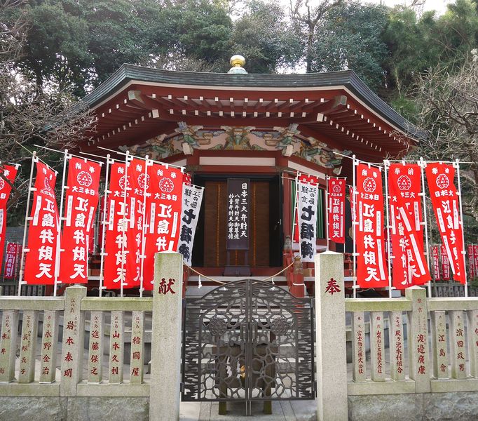 Durant la période Meiji, un certain Mr Cocking entreprit de créer un jardin privé sur l'île. Sur mon chemin, j'aperçois la « chandelle de la mer » (sorte de phare d'observation) qui se dresse en hauteur, en plein milieu du parc dédié au célèbre jardinier. Du haut de cette tour le visiteur peut jouir d'un panorama à 360° sur les environs, à près de 120 mètres au-dessus du niveau de la mer. Tout près du Hetsunomiya, se dresse le Hoanden (ci-dessous), construction octogonale abritant les statues de la déesse Benten. Souvenons-nous que cette divinité doit aussi sa popularité au fait qu'elle est la seule femme parmi les sept dieux de la bonne fortune. Sur ma route, j'observe deux jeunes filles en train de picorer un ébisembe, une grande et fine galette salée faite à partir de crustacées. Je redescends la rue principale par laquelle j'ai accédé à cette petit île qui servit aussi de site de nautisme lors des Jeux Olympiques d'été de 1964 à Tokyo. Je ne verrai pas cette fois les caves d'Iwaya, érodées par les éléments marins depuis des lustres. Celles-ci sont composées de deux cavernes, l'une mesurant 152 mètres de long et la seconde, 56 mètres. L'intérieur des caves offrent de découvrir l'histoire et la culture de l'île, grâce à un spectacle son et lumière. Avant de rentrer à Hiratsuka, je m'attarde un peu sur la grande plage de Kugenuma, où évoluent des groupes de surfeurs.