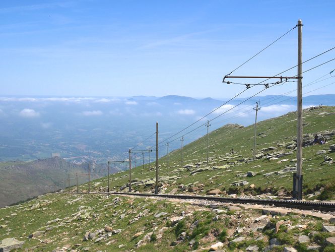 Arrivé ce matin à l'aéroport de Biarritz, j'ai aussitôt pris livraison de ma voiture de location puis déposé mes effets personnels à mon hôtel avant de me mettre en route pour ma première sortie : le Train de la Rhune. Ce sommet, situé dans les Pyrénées, se trouve au Pays basque. Appelé aussi Larrun dans la langue de ce beau pays (terme qui signifie « bonnes pâtures »), son massif est traversé par la ligne de frontière franco-espagnole, laquelle sert également de frontière entre les provinces basques du Labourd et de la Navarre. Le sommet de la Rhune est le plus haut sommet de la région, avec ses 905 mètres. Son panorama offre une vue dégagée sur les régions environnantes de la Basse-Navarre, de la Navarre, du Guipuzcoa et de côte basque bordée par le Golfe de Gascogne. On compte deux sites d'intérêt dans la Rhune, avant d'arriver au sommet : le col de Saint-Ignace, qui culmine à 169 mètres, puis le ruisseau des Trois Fontaines (à 545 mètres) sur le flanc nord de la Rhune, entre les hauteurs d'Alchangue à l'est et le Miramar à l'ouest.