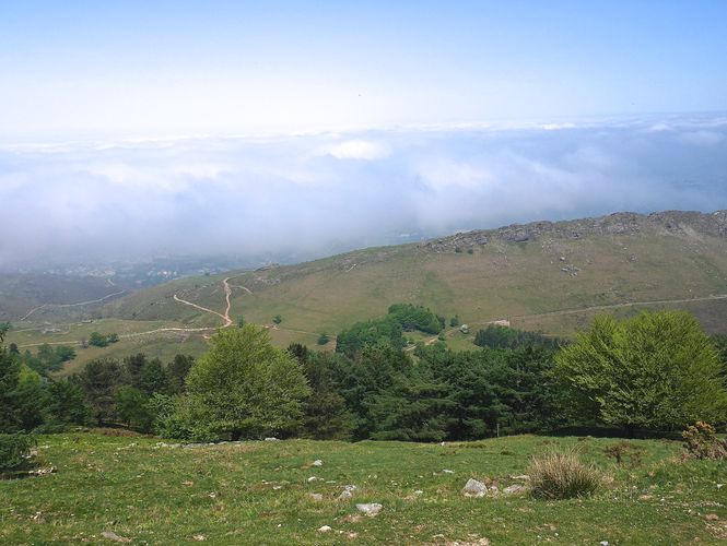 Outre des paysages magnifiques, les visiteurs peuvent apercevoir au cours de leur voyage d'étranges petits chevaux, appelés pottoks. Ces animaux robustes (ci-dessous en photo) se reproduisent librement et cohabitent avec les betiso (petites vaches rousses des Pyrénées) et les manech (brebis basques, sur cette deuxième photo). On trouve aussi plusieurs oiseaux rapaces comme le vautour fauve, le milan royal, le vautour percnoptère d'Egypte ou la gypaète barbu. Le sommet de la Rhune accueille restaurants et émetteur TV. L'émetteur fut bâti à l'emplacement de l'ancien hôtel Imperator, établissement de dix chambres mis en service en 1928. L'endroit connaitra une vie des plus mouvementées entre les problèmes de gestion, de transports de personnels jusqu'au sommet, et cette violente tempête qui ravagea l'hôtel au cours des années trente. Faute de clientèle, celui-ci cessera toute activité en 1937. Il faudra l'arrivée des Allemands lors de la Seconde guerre mondiale pour que l'endroit soit réaménagé par les observateurs de la marine de guerre allemande qui la transformeront en ...station météorologique ! Un radar et une batterie anti-aérienne y trouveront également place. A cette époque, le petit train sera réservé aux seuls besoins de l'envahisseur et Himmler l'empruntera en 1940 pour se rendre en tournée d'inspection. Mais avant leur fuite, quatre ans plus tard, les Allemands feront sauter leurs installations et détruisant en même temps une partie de l'hôtel Imperator. Les deux seules pièces encore en état serviront un temps de buvette et de cantine, en attendant que l'installation du Centre d'émission de la télévision de la Rhune n'investisse définitivement les lieux.
