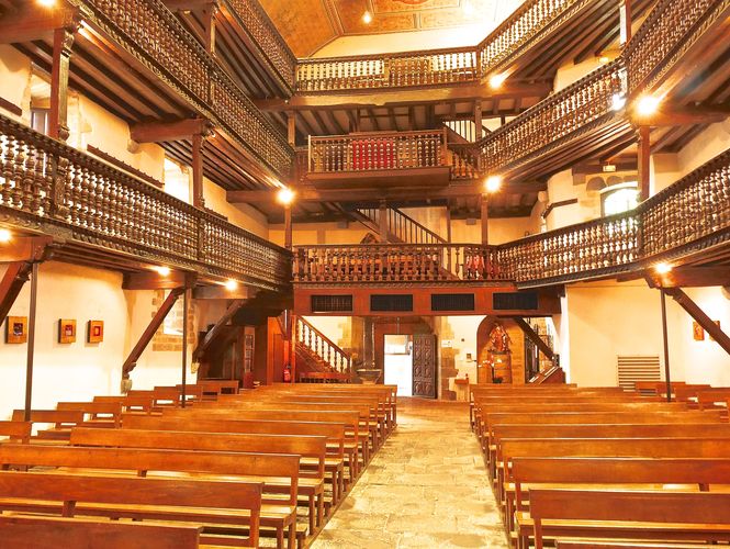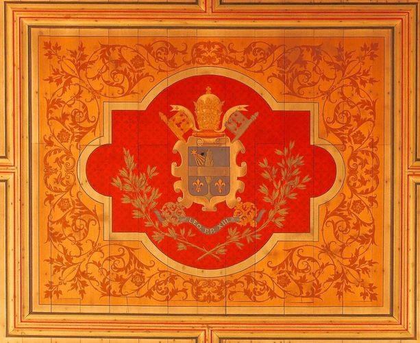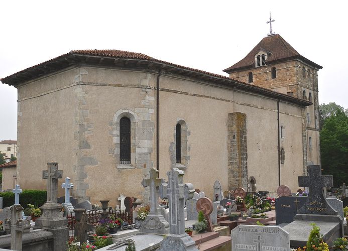 Je me rends à l'église (ci-dessous) et aperçois dans son pourtour une série de stèles plantées dans le gazon. Il s'agit de monuments funéraires en forme de pierres discoïdales, qui soulignent une vielle tradition basque consistant à planter une pierre à la mémoire du défunt et à aménager les alentours en espace vert. Chose curieuse, les inscriptions de ces stèles sont en français et non en langue basque qui était pourtant largement pratiquée jadis dans cette région. Le joli porche daté de 1627 permet de pénétrer dans l'église qui est très caractéristique de ce qu'on pouvait alors rencontrer au pays basque. A l'intérieur, je suis en effet surpris d'observer trois rangées de galeries qui étaient utilisées par les hommes uniquement, tandis que les femmes occupaient la partie basse de l'église. En fait, ces galeries étaient un moyen de créer de l'espace supplémentaire dans une église parfois devenue trop petite face à l'affluence des pèlerins. D'autre part, chaque famille disposait d'un emplacement à l'intérieur de l'église car on y enterrait les défunts. Lors des cérémonies, les familles s'installaient à l'emplacement de leurs disparus. Les femmes tout particulièrement, car, dans les familles basques, celles-ci étaient les plus à même d'entretenir le lien avec la religion et les ancêtres. En haut de ces galeries, au premier étage, un petit banc était réservé au conseil municipal, notamment lors des fêtes comme celle de la Fête-Dieu. Actuellement en cours de restauration, l'édifice est désormais classé en tant que monument historique. Il suffit de lever la tête pour admirer le superbe plafond (troisième photo) jadis repeint par un certain « Palaci » originaire d'Espelette qui, pris dans un guet-apens au Mexique, avait promis d'offrir le ravalement du plafond de l'église s'il s'en sortait. Chose promise, chose due !
