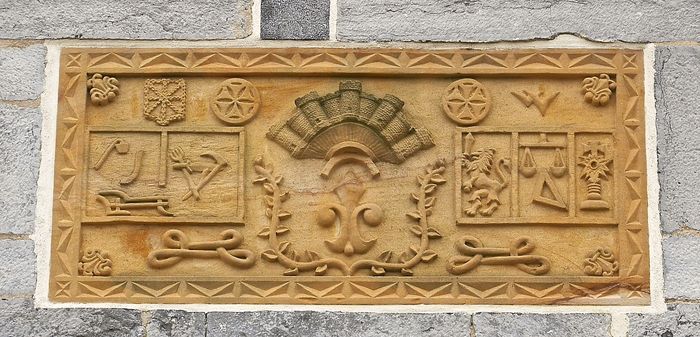 La ville compte aujourd'hui environ 2000 habitants et bénéficie d'un climat doux et de paysages variés. A mon arrivée, un marché se tient en face de la Poste et je trouve à me garer à côté de l'ancien château (en photo ci-dessous) réaménagé depuis en mairie. A ma grande surprise, l'entrée de cette mairie est surmontée d'un linteau (deuxième photo) racontant l'histoire du château : au centre de celui-ci, se trouve une sculpture représentant un château à cinq tours (des XV è au XVII è siècles, le château d'Espelette comprenait en effet cinq tours). En-dessous de cette sculpture, on observe une fleur de lys et une branche de buis (attestant de l'origine du mot Ezpeleta, qui signifie lieu planté de buis). Sur la partie gauche, on retrouve deux séries de dessins à l'intérieur d'un cadre rectangulaire avec une charrue, une pioche et une bêche, symbolisant le village agricole. Juste à côté, on aperçoit une épée, une fourche et une faux, symbolisant les relations difficiles entre le seigneur d'Ezpeleta et les habitants. Dans la partie droite, on reconnaît un lion, symbole de la province du Labourd, avant que la région ne soit annexée à la France, une balance et une équerre indiquant qu'en ce lieu s'installèrent l'école publique du village et une justice de paix de première instance jusqu'à la première moitié du XX è siècle. Ce même linteau offre d'admirer, sur sa partie gauche, le symbole des armes de Navarre (las cadenas) car les seigneurs d'Ezpeleta étaient autrefois liés à Pampelune et aux rois de Navarre.