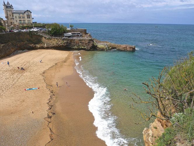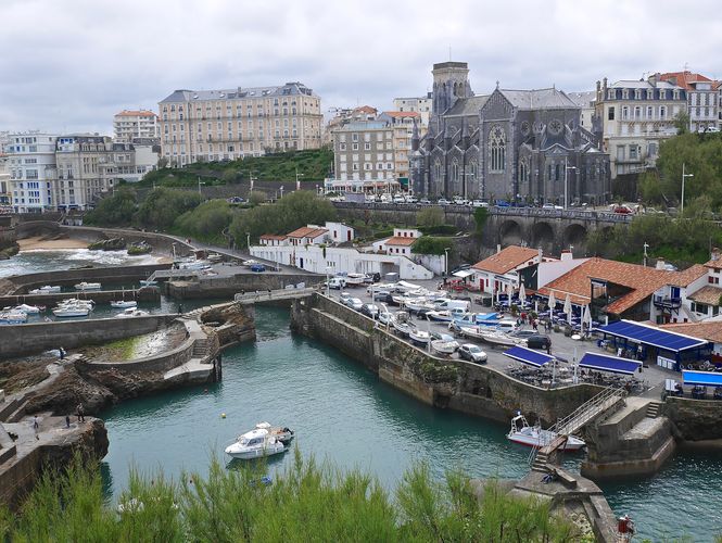 A partir de 1784, quelques années avant la Révolution française, les bains de mer deviendront à la mode dans la cité. Même Napoléon y goutera en 1808. Cependant, dès 1609, un observateur , le Conseiller de Lancre, remarque déjà cette pratique qu'il juge malséante. Les Biarrots n'auront que faire de cette opinion et continueront la baignade, au point qu'en 1774, la ville leur refusera l'installation de guérites pour se changer. Il faudra attendre le milieu du XVIII ème siècle pour que soient enfin reconnus les bains de mer en tant que thérapie efficace contre toutes sortes de maux. De son côté, Victor Hugo s'inquiètera dès 1843 de ce qui attend cette petite localité en passe de devenir une station balnéaire. L'Impératrice Eugénie décidera d'en faire sa villégiature après y avoir séjourné deux mois en 1854. Napoléon lui construira un palais, la Villa Eugénie, et Biarritz devient la reine des plages et la plage des rois. D'autres têtes couronnées découvriront aussi Biarritz : Les rois de Wurtemberg, de Belgique et du Portugal, ainsi que princes russes, polonais et roumains, et bien sûr Grands d'Espagne et Lords anglais. La ville accueillera alors jusqu'à 10 000 estivants en saison. Mon premier souci est de me rendre en bord de mer. Le temps est incertain mais quelques rayons de soleil arrivent à percer les épais nuages, comme un clin d'oeil au mauvais temps des derniers jours. Au bout de quelques minutes de marche, j'atteins la plage de Port-Vieux (ci-dessous en photo). J 'aperçois au loin quelques baigneurs audacieux qui font trempette. C'est sans doute la plus petite plage de la station mais attention, on y perd facilement pied ! De forme ovale, elle est entourée de galeries comme celles qu'on trouve fréquemment en Italie. C'est la plage favorite des habitués, abritée des vents et des vagues. Je longe ensuite la côte jusqu'à me rapprocher du Rocher de la Vierge décrit plus haut, puis me dirige vers le port des pêcheurs.