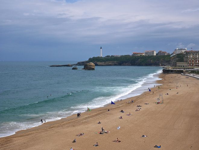 Ma visite se poursuit en direction de la Grande plage (ci-dessous). Les uns profitent des quelques rayons de soleil sur le sable tandis que d'autres, plus sportifs, pratiquent le surf. L'endroit est décrit comme l'un des meilleurs spots de surf du monde et ce n'est pas par hasard : en 1957, Peter Vertel, l'époux de l'actrice Deborah Kerr alors en tournage dans la région pour le film « Le soleil se lève aussi », débarque avec ses planches de surf sur la plage de la Côte des Basques. Et les Biarrots d'observer, médusés, le premier homme à se tenir debout sur une vague! Très vite, ce sport tout droit venu d'Hawaii trouve ses adeptes comme par exemple Joël de Rosnay, Georges Hennebutte, Jo Moraïz ou Emmanuelle Joly-Thomas. Au loin s'élève le phare de la ville, situé à la pointe Saint-Martin (deuxième photo). Bâti entre 1830 et 1832, il a depuis été classé comme monument historique, en 2009. En forme de tour conique et de couleur blanche, il mesure 47 mètres de haut, se trouve à 75 mètres au-dessus du niveau de la mer et comporte un escalier de 248 marches.