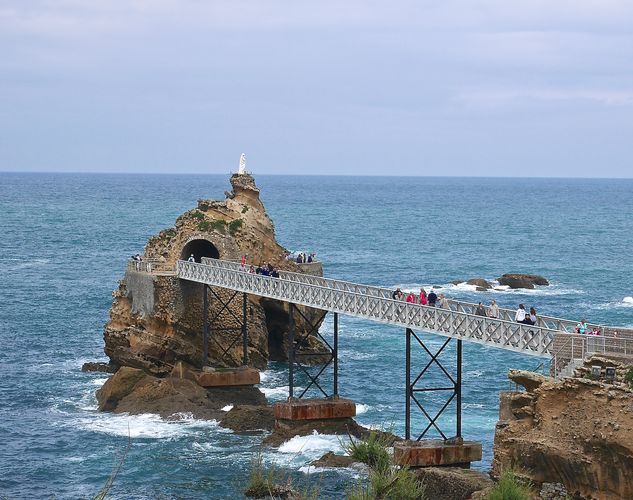 Aujourd'hui est jeudi de l'ascension. Pas celle du pic du Midi, mais cette fête chrétienne célébrée quarante jours après Pâques, qui marque l'élévation au ciel de Jésus Christ après sa résurrection et la fin de sa présence sur terre. A Biarritz, pour la Vierge, ce jeudi est un jour comme un autre : celle-ci domine toujours le rocher portant son nom (ci-dessous), qui attire tant de monde. Curiosité naturelle touristique, le rocher a la forme d'une coque de bateau et de son sommet, on peut admirer toute la baie de Biarritz, ma destination du jour. Plus exactement situé entre la plage de Port-Vieux et le port des pêcheurs, le célèbre rocher de la Vierge était autrefois une presqu'ile. On le surnommait d’ailleurs rocher de Cucurlon au XV ème siècle. C'est l'empereur Napoléon III qui fera percer celui-ci afin de permettre la construction d'un port-refuge et d'une digue. Et un viaduc de 76 mètres de long d'être bâti pour relier le rocher à la côte. C'est en 1865 que sont érigées quelques croix et une statue de la Vierge. Cette dernière sera bénie le 11 juin de la même année, par le curé de Biarritz, l'abbé Casaux. Le viaduc d'origine sera quant à lui remplacé en 1887 par une passerelle métallique que l'on attribue trop souvent à tort aux ateliers Eiffel.