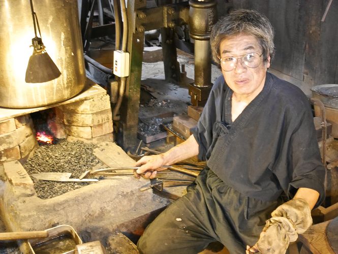 Les ciseaux Sasuke sont forgés à la main, pièce par pièce, et la fabrication comporte pas moins de cinquante étapes, depuis l'allongement du métal à la fusion acier sur fer, du pliage des bras au revenu, de la fabrication de la vis centrale au poinçonnage, de la trempe à l'aiguisage...ces ciseaux-là sont faits pour durer des siècles, et quatre à cinq jours sont nécessaires pour forger une paire de ciseaux. On trouve ainsi des ciseaux pour ikebana (art floral), pour fleuriste, des ciseaux de jardinage et des ciseaux à bonsaïs.La particularité de ces outils réside dans la torsion créée au marteau sur l'arrière de la lame, qui donne ce tranchant incomparable tant recherché par les professionnels de tout le pays. Cette technique se transmet depuis la première génération et permet d'améliorer considérablement la longévité du tranchant. Jusqu'à maintenant, ces ciseaux n'ont jamais connu de pièces refaites, ou de production en série. Chaque lame est forgée à la main par le maitre Yasuhiro Hirakawa (ci-dessous), avec un fer tendre et pur appelé gokunan, et un acier Yasuki Shirogami. L'atelier Sasuke fabrique treize variétés de ciseaux et douze variétés de couteaux. Réputés inusables, ces outils sont principalement vendus à une clientèle de professionnels : les ciseaux sont par exemple acquis par des professionnels (95%). Leur prix varie de 800 à mille euros en moyenne mais peut atteindre ...30 000 euros pour une commande spéciale ! Le prix des couteaux varie de soixante à 150 euros, pouvant aller jusqu'à 500 euros pour des pièces d'exception. Au Japon, un apprenti-forgeron passe les cinq premières années d'apprentissage à exécuter des tâches plus ou moins ingrates, avant de s'exercer à l'art de la forge. Cela fait trois ans qu'Eric est apprenti et il fait partie intégrante de la famille, mais il lui faudra encore attendre sept ans pour commencer à être un véritable forgeron.