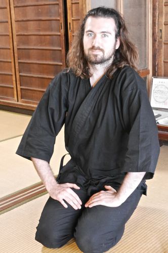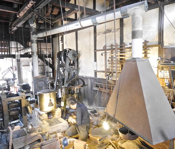 Sur place, je rencontre Eric Chevallier (ci-dessous), apprenti-forgeron à l'atelier Sasuke de Sakaï. L'histoire des ciseaux Sasuke débute en 1867 avec la reconversion de Sadajiro, alors forgeron en arquebuses, en ciselier, à la suite d'un séjour d'apprentissage sur l'île de Tanegashima, endroit jadis réputé pour ses ciseaux. La fabrication d'armes n'étant plus suffisante pour vivre, de nombreux autres artisans se tournèrent vers la forge d'outils du quotidien. Français d'origine, Eric tombera amoureux de la culture japonaise très tôt, alors qu'il était adolescent, et apprendra la langue japonaise tout seul, avant de partir avec un aller simple pour le pays du soleil levant, en 2012. Il travaille depuis aux côtés du maitre artisan ciselier traditionnel, Yasuhiro Hirakawa. Sa journée débute par l'exécution de tâches ménagères simples qui font partie intégrante de son apprentissage de forgeron. L'entretien de la maison, du jardin et les prières au sanctuaire lui sont ainsi confiés quotidiennement. Ici, on recycle les déchets de la forge, et l'on trie la poussière qui comporte souvent des débris de fer réutilisés plus tard. On coupe aussi le charbon en petits morceaux. Celui-ci servira ensuite, avec la houille, à alimenter le foyer de l'atelier de forge qui est finalement autosuffisant.