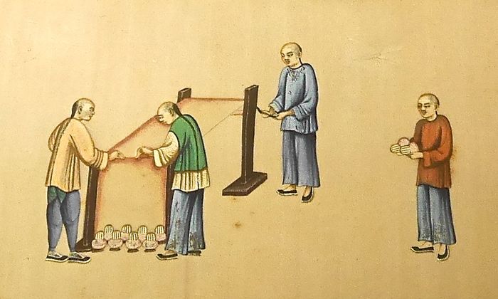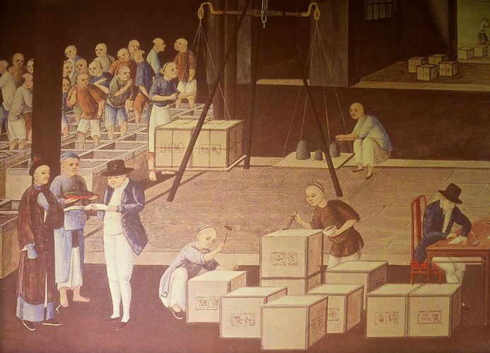 Le commerce et l'industrie prendront toute leur place à Guangzhou, dès le XVIII ème siècle, commerce trouvant son origine dès le milieu de la dynastie des Ming, lorsque l'autorisation fut donnée aux marchands Hong de la ville de développer le commerce avec l'étranger. Celui de la soie occupait une place prépondérante grâce aux marchands étrangers qui l'exportèrent largement vers l'Europe, en Amérique ou vers l'Asie du sud-est. Le thé, lui aussi, occupera une place de choix dans le commerce du port de Canton, au cours des XVIII et XIX ème siècles (comme sur cette deuxième photo ci-dessous, en 1820). Breuvage dont s'enticheront les Européens qui adopteront par la suite un grand nombre de chinoiseries, ces objets d'art dont l'esthétisme procèdera du courant orientaliste. Et l'Europe d'imiter la sophistication technique des céramiques chinoises d'alors, avec plus ou moins de succès. Les premiers signes de cette d'art rococo apparaitront au début du XVII ème siècle grâce à des pays comme la Hollande, l'Angleterre, ou la Suède (celle-ci importera ainsi cinquante millions de pièces de porcelaine depuis Canton, entre 1731 et 1836, grâce à la Swedish East Indian Company).