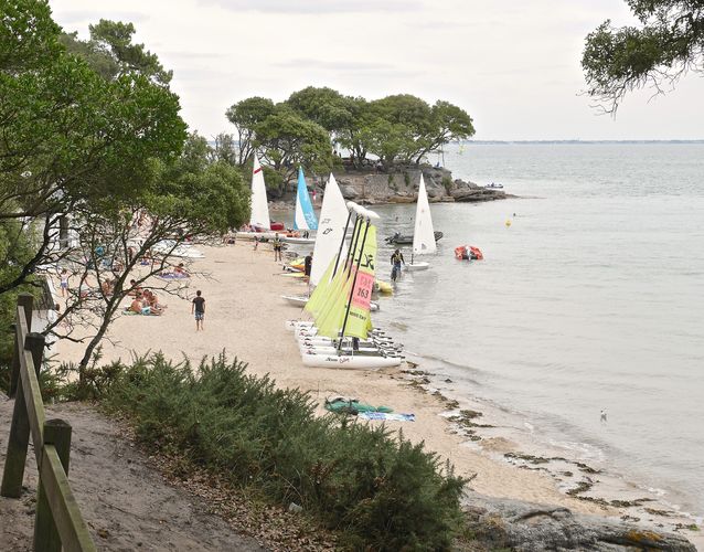 Après avoir traversé les plages des Sableaux et la pointe Saint Pierre (ci-dessous), nous atteignons la plage des Dames en traversant le Bois de la Chaise (deuxième photo) : ce bois est caractérisé par une forte présence de chênes verts depuis plus de 8000 ans. Pourtant, l'endroit subit deux grandes dévastations. La première eut lieu en 1674 avec le débarquement des Hollandais dans l'Anse de la Claire, tout près du bois (que ceux-ci détruisirent partiellement). Il faudra attendre le XVIII è siècle pour que la chênaie se régénère. La seconde dévastation eut lieu lors de la révolution française, à l'hiver 1793, lorsque les troupes républicaines et les habitants saccagèrent le Bois de la Chaise pour se chauffer. En 1822, Jean Corneille Jacobsen obtiendra une concession à durée déterminée de la forêt domaniale, puis deviendra inspecteur général des bois du Roi, deux ans plus tard. Une première campagne de reforestation infructueuse aura alors lieu avec peupliers, ormeaux, saules et chênes blancs. La seconde campagne, elle, sera cette fois un succès, grâce, sans doute, au semis de pins maritimes. D'autres espèces végétales seront aussi introduites, comme le pin maritime des Landes ou le cyprès de Lambert (sur le front de mer), tandis qu'acacias, mimosas et arbousiers enrichiront l'intérieur du bois. La faune de l'endroit est composée de pigeons ramier, de mésanges bleues, de fauvettes à tête noire et de hiboux petit Duc. On y trouve aussi de nombreux insectes comme le Sphinx de troène, le papillon familier du bois ou la lucane cerf-volant. Le Bois de la Chaine est bordé de cinq plages : Les Sableaux, la Pointe Saint Pierre, la plage des Dames, l'Anse rouge et les Souzeaux. Le désenclavement du bois débutera au début du XIX è siècle avec la création d'un réseau de chemins. Puis le percement, en 1903, de l'avenue de la plage (l'actuelle avenue Georges Clémenceau). Quelques années auparavant, en 1859, Jules Piet avait créé la Société des Bains de mer de Noirmoutier, avec six cabines de bain situées sur l'Anse des Souzeaux. Cette société sera bientôt transférée à la plage des Dames (troisième photo ci-dessous), plus à l'abri des vents. Les baigneurs pouvaient alors se changer dans les cabines, respectant ainsi l'arrêté municipal concernant la pratique du bain nu (celui-ci n'était alors autorisé que sur certaines plages, avant d'être carrément supprimé en 1877).