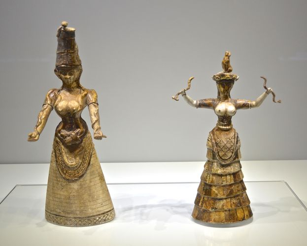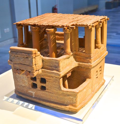 La troisième salle aborde l'histoire des palais de Knossos et de Phaistos. On peut y admirer des poteries de Kamarès, comme des tasses colorées. La période protopalatiale de la civilisation minoenne correspond à l'apogée de ce style. Le nom de Kamarès provient de la grotte située sur le Mont Ida, où l'on découvrit pour la première fois des vases de ce style. On imagine que ces vases contenaient autrefois des liquides et de la nourriture, autant d'offrandes pour la divinité de cette grotte. Le style de Kamarès apparaît comme étant l'un des styles les plus décoratifs de l'histoire mondiale de la peinture sur céramique. L'apogée de la civilisation minoenne est décrit dans la salle 4. C'est là que j'apercevrai la maquette d'une maison d'époque (ci-dessous). Cette civilisation est décrite comme autonome et remonte à une période allant de 2700 à 1200 ans avant J.C. Elle tient son nom du légendaire roi Minos et est caractérisée par une activité culturelle et artistique exceptionnelle. A cette époque, on était déjà capable de pratiquer l'écriture. De plus, cette civilisation était extrêmement organisée grâce à un système politico-religieux élaboré, et l'instauration d'échanges commerciaux avec les pays voisins. Il existe en fait trois périodes distinctes : le minoen ancien (âge du bronze ancien), le minoen moyen (âge du bronze moyen) et le minoen récent (néopalatial). L'âge d'or minoen correspond aux années 1600-1100 avant J.C, date à laquelle apparaît l'écriture dite linéaire A, toujours pas déchiffrée à l'heure qu'il est. A cette époque correspondent les magnifiques fresques (deuxième photo) du Palais de Knossos, visible au premier étage du musée, mais également des statuettes à vocation religieuse, des bijoux raffinés, des sarcophages et des céramiques. On pense que cette civilisation fut probablement organisée autour d'un culte des déesses. Je pourrai d'ailleurs en voir certaines sur place comme la déesse aux serpents (troisième photo). La prospérité économique favorisera l'accroissement de la population minoenne, permettant ainsi à Knossos de compter, vers 1450 avant J.C, près de 80 000 âmes selon Sir Arthur Evans, riche aristocrate britannique passionné de fouilles (mais plus probablement 15 000 selon les estimations actuelles). Que s'est-il passé à partir de cette date ? On observa un brusque effondrement de la civilisation minoenne, avec la destruction par le feu de tous les palais de l'île (à l'exception du Palais de Knossos). Plusieurs hypothèses existent mais on pense qu'un cataclysme lié à une brutale éruption volcanique ravageant à l’époque l'île de Santorin aurait pu causé la perte des Minoens, avec effondrement soudain de l'économie dû à la disparition de la flotte commerciale. Privés de ressources, les Crétois n'auraient plus été en mesure d'importer les céréales nécessaires à leur alimentation, devenant ainsi une proie facile pour les envahisseurs venus de Grèce. C'est en effet à cette époque qu'arriveront les Mycéniens (et leur écriture linéaire B, qui, elle, fut déchiffrée au cours des années 1950)