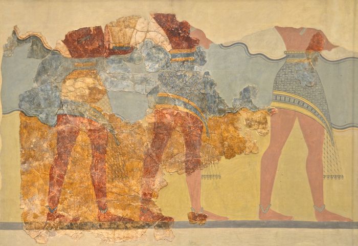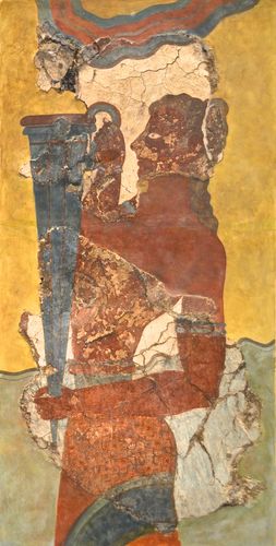 Les fresques murales (exposées au premier étage du musée, en photo ci-dessus) ont une longue histoire en Crète. Les murs des habitations étaient recouverts de fresques peintes en rouge ou en brun, à l'époque du Minoen moyen. Dans les palais de Knossos et de Phaistos, il apparaît que les murs étaient décorés de motifs ornementaux sur plâtre, mais il faudra attendre la construction des seconds palais (après le cataclysme) pour que ces fresques murales se banalisent. La base de ces compositions était un enduit à la chaux. On utilisait alors surtout le noir, le blanc, le rouge, le jaune, le bleu et le vert. IL arrivait que ces fresques soient légèrement en relief dans le but de créer un effet tridimensionnel (deuxième photo ci-dessus). A noter que les fresques retrouvées proviennent surtout de Knossos et de Théra. On en trouve aussi certaines d'Haghia, de Triada,de Tylissos ou d'Amnissos.