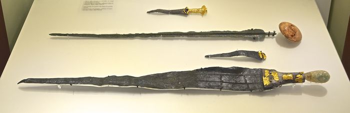 Je pénètre dans la première salle qui est consacrée aux premières communautés et à la Crète préhistorique : Faute de témoignages écrits, la chronologie des périodes anciennes de l'île est essentiellement fondée sur le style des poteries égéennes et proche-orientales. On sait que la Crète a été habitée dès le Paléolithique. La Méditerranée se trouvait alors cent mètre en-dessous de son niveau actuel et il aurait été assez aisé d'atteindre l'île depuis le Péloponnèse. La seconde salle aborde la construction des premières villes et des premiers palais. Des vitrines exposent des objets retrouvés dans des cimetières de jadis mais aussi des symboles de l'autorité d'alors comme par exemple ces sabres (photo ci-dessus) datant de 1800-1700 avant J.C , et retrouvés à Malia, ancienne ville qui était autrefois située sur la côte nord de l'île.