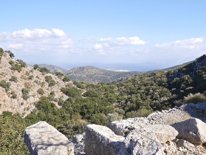 Insatiable, je pars maintenant en direction de Lato, ancienne cité dorienne située sur un site superbe. Lato fait partie de ces nombreux sites archéologiques de la région d'Agios Nikolaos, et est considéré comme la ville la mieux préservée de l'époque classique-hellénisque en Crète, et l'une des villes anciennes les plus complètement conservées de Grèce. Ses vestiges de construction appartiennent au IV è siècle et au III ème siècle avant J.C. Lato était une ville fortifiée, dont les maisons étaient bâties sur des terrasses. Elle possédait une agora, un prytanée (l'équivalent de notre Hôtel de ville actuel), des temples et un théâtre creusé dans la roche. J'avoue me perdre un peu au milieu de tous ces blocs de pierre. Certes, je reconnais bien les énormes blocs savamment disposés de l'une des trois entrées successives qui constituaient l'accès à l'ancienne cité. Un passage dallé serpente bien entre les restes des hauts murs mais je reconnaitrai plus facilement les marches qui mènent à l'agora. Sur la droite (c'est à dire côté sud) s'alignaient les magasins, tandis qu'une puissante muraille, renforcée par des tours, courait sur le côté gauche. L'agora, elle, est fermée au nord par les gradins du prytanée. L'espace central est quant à lui occupé par une vaste citerne et un petit temple. La beauté de l'endroit est saisissante et je comprends mieux l'intérêt stratégique de cette place forte qui dominait les environs (troisième photo). Je distingue au loin la baie de Mirabello. Cette cité fut détruite aux alentours de 200 avant J.C mais son port, Lato Etera, situé près d'Agios Nikolaos, fut utilisé durant le règne romain. On pense que cette ville fut nommée d'après la déesse Léto (Lato est la forme dorienne du nom) et fut mentionnée dans les tablettes en linéaire B, sous le nom de RA-TO. Lato produisit sa propre monnaie, à l'effigie de la déesse Ilithyie, déesse de l'enfantement dans la mythologie grecque, et plus particulièrement décrite comme la déesse des douleurs de l'enfantement. Quant à la déesse Léto, elle était, dans la mythologie grecque, une maitresse de Zeus. Et mère d'Artémis et d'Apollon. Et à ce titre, elle encourra la colère d'Héra, laquelle la fera poursuivre par le serpent Python et n'aura de cesse de la tourmenter. On retiendra aussi que Néarque, l'amiral d'Alexandre le Grand, naitra à Lato.