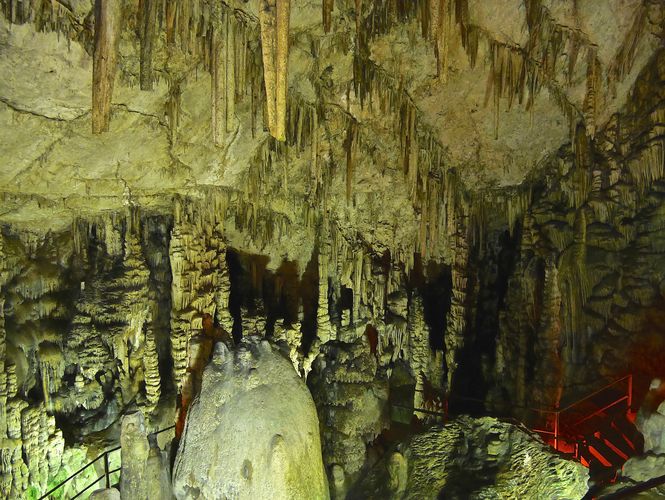 L'autre curiosité du jour est la grotte du mont Dikti, qui se trouve à un kilomètre du petit village de Psykhro, toujours sur le plateau du Lassithi. L'endroit est aussi appelé l'antre du Dikté. Selon le poète archaïque Hésiode, Rhéa aurait mis au monde Zeus dans une caverne du Mont Egée, près de Lyttos. Lors de fouilles, à la fin du XIX è siècle, ce site fut identifié comme celui décrit par la poète. Dans la mythologie grecque, la grotte du Dikté est connue comme le lieu où la chèvre Amalthée nourrit Zeus, cachée dans cette grotte par sa mère Rhéa (sœur et femme du Titan Cronos) pour éviter que son père Chronos ne le dévore. La grotte (ci-dessous) fut découverte en 1886 par des paysans, puis sera fouillée la même année. En 1894, Arthur Evans se procurera auprès d'eux de nombreux objets votifs, des figurines humaines et animales et des armes en bronze provenant peut être d'une grotte. Un an plus tard, il se rend dans la grotte en question et y découvre des objets similaires, ainsi qu'une tablette en bronze avec des inscriptions. Puis, au printemps 1896, un autre paysan découvre un fragment de table à libations en stéatite, dont on retrouvera à nouveau un autre fragment à un an d'intervalle. Finalement, la British School se déplacera à l'été 1900 pour fouiller elle-même l'endroit. La grotte du Dikté est formée de deux parties, la première glissant vers la seconde, plus profonde. Et fut sans doute très fréquentée au Minoen moyen. En effet, des poteries retrouvées dans sa partie haute confirment cette hypothèse. Mieux vaut avoir du souffle pour gravir le sentier empierré qui conduit à la grotte, perchée à 1025 mètres d'altitude. Cette ascension me prendra un bon quart d'heure à pied. Dommage que nous soyons en période creuse, car l'été, l'ascension peut se faire à dos de mulet. C'est plus reposant. Tout haletant à mon arrivée au sommet, je me consolerai de cette souffrance passagère en apprenant que les deux dames qui tiennent la billetterie du site font ce même parcours tous les jours de la semaine...