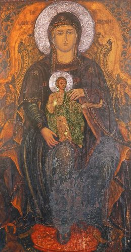 Le complexe monastique est construit sur les pentes sud du mont Dikti et se développe sur trois niveaux. Les destructions successives contraignirent les moines à rebâtir une bonne partie de l'ensemble au XX è siècle, mais c'est l'aile nord qui reste la partie la plus ancienne du monastère. Le katholikon est le résultats d'ajouts successifs à une petite église à nef unique, avec trois agrandissements datant du XIV è siècle. Le décor mural est très riche mais aussi très ancien, ce qui explique l'absence d'éclairage lors de ma visite et une certaine détérioration des fresques. Seule la lumière de l'extérieur me permettra de distinguer les œuvres présentées par la nonne. L'église principale fut peinte peu à peu, et la peinture la plus ancienne (qui se trouve dans les nefs centrale et sud) date de la seconde moitié du XIV è siècle. Revenons quelques instants sur le trésor du monastère, l'icône ancienne de la Vierge Kardiotissa (différente de l'icône ci-dessous) : elle serait l'oeuvre de Lazaros, moine ayant vécu et connu le martyr en Crète, à l'époque des Byzantins. L'icône, bien qu'appelée Kardiotissa, appartient au type de la Vierge de la Passion, établie au XV è siècle par les peintres crétois d'alors. Après un thé et des gâteaux gracieusement offerts par mes hôtes, je reprendrai la route, en direction d'un autre monastère, celui de Vidianis.