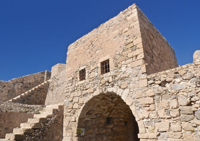 Je marche une dizaine de minutes et atteins le littoral. Au bord de la plage, on se détend en prenant un café à la terrasse des nombreuses tavernes. Cité d'affaires modeste, où la classe moyenne se presse du matin au soir, la ville se soucie peu de ses visiteurs mais, à force de persévérance, je rencontrerai tout de même de bonnes âmes pour m'indiquer le chemin. Iérapetra est la quatrième ville de la Crète, et la seule cité crétoise donnant sur la mer de Libye. Son histoire remonte à la période minoenne, et la ville deviendra même la ville dominante de l'est de l'île sous la période gréco-romaine. Elle fut aussi célèbre pour ses actes de piraterie et participa à la guerre de Crète, en 205-200 avant J.C, aux côtés de Phillippe V de Macédoine, contre Knossos et Rhodes. Entre les XIII è et XVII è siècles, Iérapetra vécut sous la domination des Vénitiens. Ceux-ci y bâtirent la forteresse de Kales (ci-dessous) afin de protéger le port. Juste de l'autre côté de la rue, en face du port, j'aperçois une jolie petit église de style byzantin.