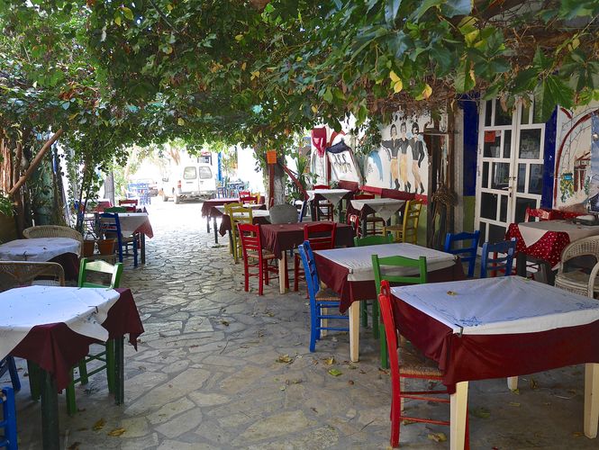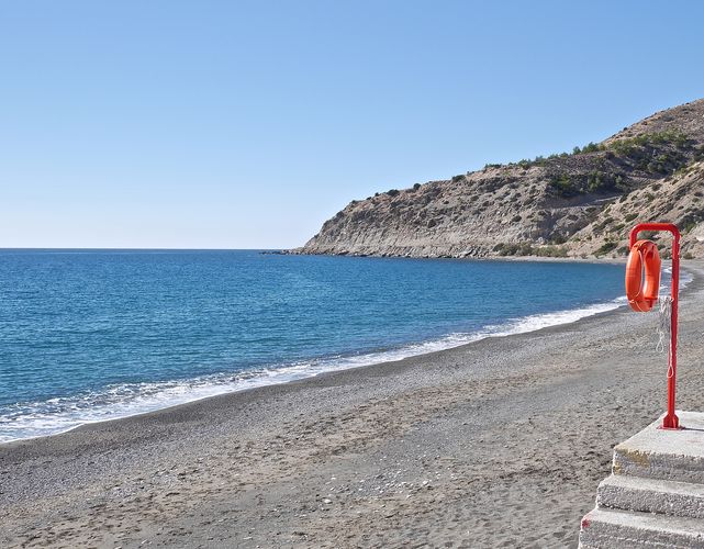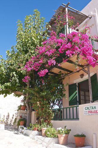 Je reprends mon véhicule et me rends à Myrthos, en empruntant une route côtière qui est, la plupart du temps, couverte de serres sous lesquelles une main d'oeuvre surexploitée cultive tomates, concombres, melons et bananes. On doit cette situation à Paul Kuypers, un agronome néerlandais qui eut l’idée, au cours des années 1960, d'inciter les agriculteurs locaux à pratiquer ce type de culture que l'Union européenne subventionnera généreusement par la suite. C'était sans compter sur la dégradation du plastique, une génération plus tard, qui affecte aujourd'hui l'écosystème côtier, et ce, durablement. Myrthos, elle, est une coquette localité, très appréciée des Allemands. D'emblée, j'admire ses maisons fleuries (ci-dessous) et ses ruelles ombragées (deuxième photo). J'y croiserai non seulement des habitants charmants, des chats et des chiens qui prennent le soleil (comme les touristes!) et vous regardent du coin de l'oeil, mais aussi hibiscus, géraniums et bougainvilliers. Il existe indéniablement ici une douceur de vie. Après être descendu jusqu'à la plage (troisième photo), je remonte jusqu'à une petite église, située à côté d'une école et du musée local, malheureusement fermé à cette époque. Celui-ci rassemble pourtant la collection privée d'un ancien instituteur du village, avec quelques vestiges minoens trouvés dans la région. On y trouve enfin une section folklorique. Même si je m'y attarde pas, il est utile de savoir que bon nombre de touristes fréquentent Myrthos pour ses plages. La principale est certes constituée de sable et de galets, mais, en poursuivant la route côtière vers l'ouest, il est possible de découvrir des criques quasi désertes, avec une eau très claire.