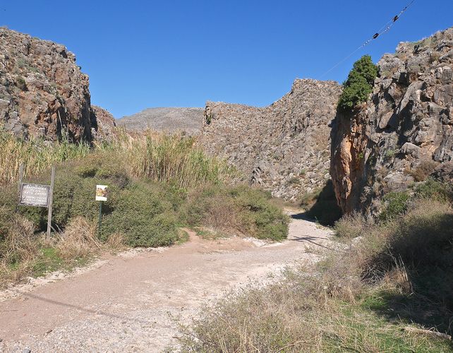 A côté du site archéologique s'élève la vallée des morts (ci-dessous en photo). La promenade se fait facilement et n'est que de quelques centaines de mètres, à travers les champs d'oliviers. Quelques panneaux sommaires donnent des indications sur le temps nécessaire pour effectuer les excursions disponibles. Je m'arrête à l'entrée du chemin empierré conduisant à la vallée et à ses paysages : ce parcours est parfois humide et s'insinue entre d'impressionnantes falaises creusées et de grottes, tandis que lauriers et oliviers s'épanouissent dans le fond caillouteux de la gorge. Cette vallée (aussi dénommée gorge) a reçu le nom de vallée des morts à cause des nombreux tombeaux qui y ont été trouvés, à l'intérieur de cavernes ou sur les versants abrupts. Compte tenu de la beauté du site, les Minoens imaginaient que leurs disparus survivaient ainsi, dans la beauté de l'au-delà.