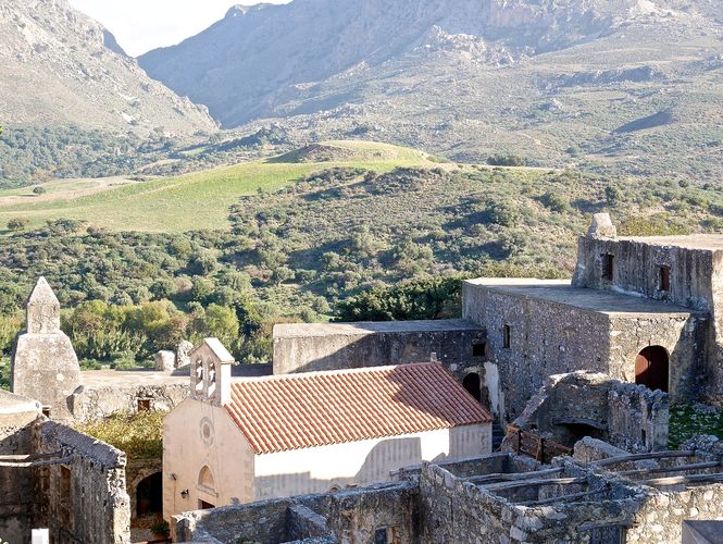A nouveau sur la route, en direction de Plakias, je fais un crochet par le monastère de Previli, monastère qui comprenait à l'origine deux parties : une partie (ci-dessous) qui fut ravagée durant la seconde guerre mondiale, en contrebas de la route, et demeure désormais au milieu des rochers et de la végétation. L'autre partie, elle, forme le monastère principal, étonnant monument commémoratif de la guerre de Crète où l'on peut voir la statue d'un pope, mitraillette à la main. Haut-lieu de la résistance contre les Turcs, Preveli s'illustrera aussi sous l'occupation allemande, en servant d'abri à de nombreux combattants grecs, mais également à des soldats néo-zélandais et britanniques durant la Bataille de Crète, en 1941.