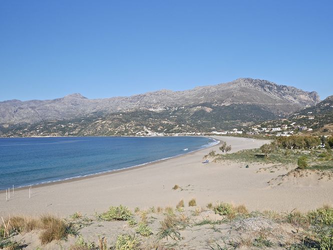 Le paysage qui m'entoure est superbe, et j'atteins bientôt Plakias, petite station balnéaire située dans une jolie baie. A part la plage (ci-dessous), on n'y trouve rien d'exceptionnel, sinon que la station peut servir de camp de base pour visiter les environs. Les amateurs de panoramas poursuivront leur route jusqu'à Frangokastello, pour admirer les paysages environnants depuis les falaises surplombant la grande bleue. Sur place, on distingue la silhouette carrée, crénelée et cantonnée des tours du château de l'endroit, se détachant de la plaine côtière. Erigé au milieu de nulle part par les Vénitiens au XIV ème siècle, il était conçu pour protéger le pays des incursions des pirates, mais sa construction ne s'achèvera que très tardivement, à cause de l'opposition de la population locale. Le château ne sera vraiment armé que par les Ottomans et vivra la capitulation de Daskalogiannis en 1770.