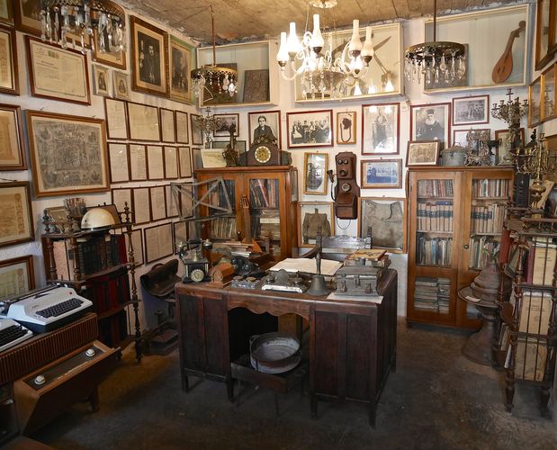 Je fais une halte dans le village d'Asomatos, connu pour ses ateliers de poterie mais surtout pour son musée Oriséum, oeuvre du Pope Michalis Georgoulakis (ci-dessous):autour d'une cour fleurie, et dans un joyeux bric-à-brac, se trouve tout ce que notre collectionneur en herbe a amassé sa vie durant. On trouve parfois des objets insolites illustrant la vie crétoise des XIX et XX ème siècles. Comme ce fauteuil à un seul bras, pour pouvoir dégainer plus vite en cas de besoin. Cet endroit vous transporte dans un autre monde, un monde imaginé par le Pope dès l'âge de quinze ans. Sa clairvoyance et sa conception de la réalité temporelle (« la présent devient très vite du passé » disait-il) sont à la base de cette collection d'objets uniques. J'y repérerai des choses de la vie quotidienne, des antiquités, mais également des objets liés à la guerre, à l'artisanat local, et même des vêtements ecclésiastiques. Notre collectionneur installa ce musée à l'intérieur de la maison paternelle, musée qu'il décora lui-même avec des lampes, des chandeliers et de nombreuses plantes. Papa Michalis, comme on le surnommait ici, décéda en octobre 2008, âgé de 87 ans, mais son musée reste fidèle au rendez-vous des curieux comme moi, grâce à son fils, Georgios. A noter que les objets sont décrits en quatre langues (grec,anglais, allemand et français), et que le musée accueille un café et une boutique de souvenirs. Des manifestations culturelles s'y déroulent parfois, comme des concerts ou des expositions photos.