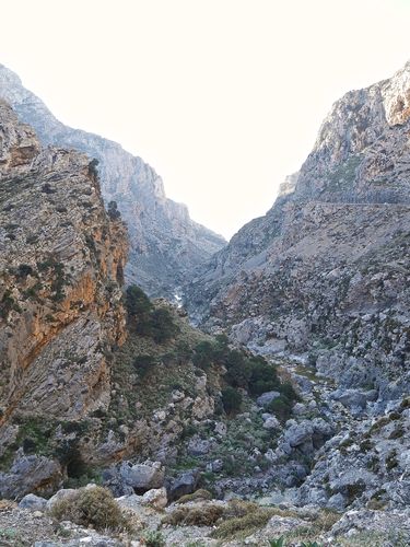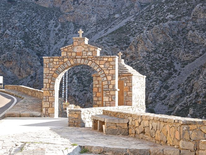 La Crète, plus grande île grecque avec une superficie de 8336 km2, est la cinquième île de Méditerranée, juste après la Corse. C'est le territoire le plus méridional d'Europe, mais aussi une île montagneuse qui culmine à 2456 mètres avec le mont Psiloritis, où je vous ai emmené avant hier. Ses paysages alternent ainsi entre montagnes, plateaux et plaines, mais comportent aussi des gorges, comme celles de Kourtaliotiko (en photo ci-dessous), que je traverse ce matin pour me rendre sur la côte sud de Réthymnon. C'est ma dernière journée dans la région et je souhaite faire un tour sur le littoral afin de voir à quoi ça ressemble. Les gorges sont également connues sous le nom des gorges d'Asomato, un petit village situé à quelques kilomètres de là, et sont, bien sûr, traversées par la rivière Kourtaliotiko. Un autre village, Koxare, se trouve, lui, à la fin de ces gorges. Pour les courageux, il est possible d'y descendre en empruntant l'arche d'entrée (deuxième photo) qui conduit plus bas à une église dédiée à Saint Nicolas et à une chute d'eau d'une quarantaine de mètres. Les falaises voisines servent aussi de lieu de nidification pour les vautours.