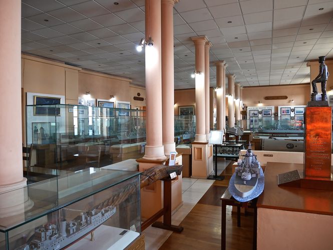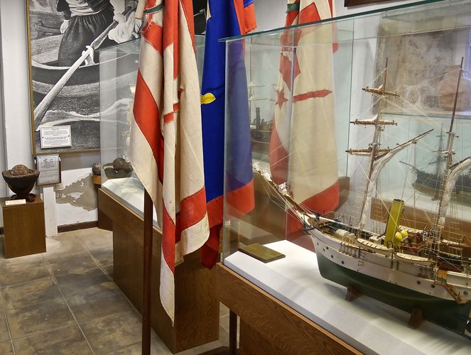 Il existe à Chania le Musée maritime de Crète, qui rassemble, sur 840 m2 une vaste exposition de ce que fut la marine crétoise depuis l'âge de Bronze jusqu'à nos jours. Y sont abordées notamment les périodes byzantine, vénitienne, et de la seconde guerre mondiale. Installé dans la forteresse Firkas, le musée ouvrit ses portes en 1973. Le bâtiment à deux niveaux propose une quinzaine de salles d'exposition qui présentent l’histoire maritime de l'île, depuis la période antique jusqu'à la dernière guerre mondiale. Le rez-de-chaussée offre ainsi d'admirer plusieurs modèles de bateaux anciens, et une maquette de la ville de Chania fortifiée, puis le port sous la domination vénitienne. Une autre maquette présente un chantier de construction naval et des bâtiments de réparation, puis la reconstruction d'un modèle ancien de navire à avirons, le Minoan (voir plus bas le paragraphe qui lui est consacré). Je débute ma visite par la première salle, consacrée aux symboles de la marine crétoise (ci-dessous), comme par exemple Saint Nicolas, protecteur des marins, dont on peut voir une peinture sur place, mais aussi l'ancre, le drapeau, ou encore les obus d'artillerie qui découragèrent l'assaillant à plusieurs reprises. Les amateurs de coquillages sont eux aussi gâtés car l'exposition en présente un grand nombre, tout en sensibilisant le public sur l'importance de la préservation du milieu maritime.