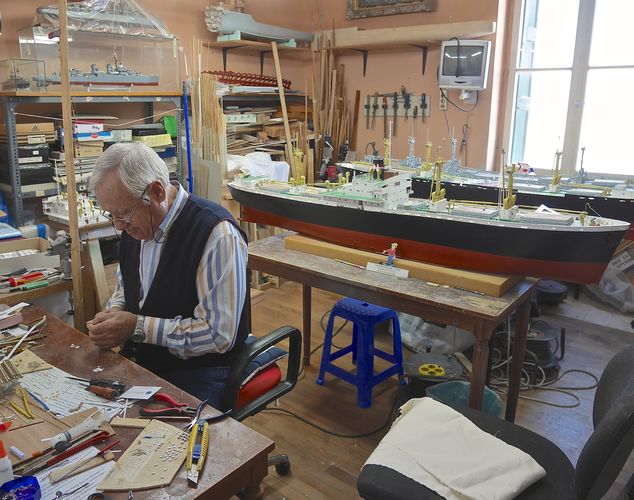 Je parcours la salle principale du niveau supérieur, constituée essentiellement de maquettes de navires de guerre, réalisées et entretenues par un maquettiste (deuxième photo) oeuvrant en toute discrétion dans un atelier aménagé à proximité. C'est sa façon à lui de prendre la mer quotidiennement.
