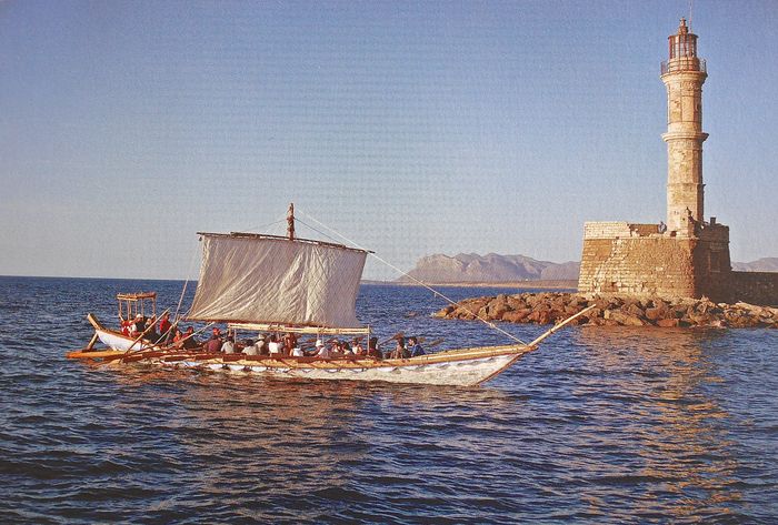 De son côté, le projet de reconstruction, grandeur nature, d'un navire minoen (ci-dessous), nécessita quatre années complètes de travail, entre 2001 et 2004, et, faute d'archives disponibles, ce projet sera développé d'après une approche empirique et en utilisant des techniques nouvelles. L'objectif fut de reconstituer un bateau à rames du XV ème siècle avant J.C, d'après le savoir-faire de l'école d'architecture navale crétoise, de l'autre côté du port, à l'ancien dock de Moro. On commença par tailler la pièce maîtresse de la coque en utilisant un tronc de cyprès de 22 mètres de long. La construction débuta en décembre 2002, avec la collaboration de charpentiers crétois qui donnèrent bientôt forme à une embarcation de 17 mètres de long et quatre mètres de large. Les pièces en bois étaient attachées entre elles à l'aide de cordages, puis on calfata le bateau avec un mélange de graisse de bœuf et de résine savamment dosé puis chauffé avec un feu. Des cordages trempés dans ce mélange furent bientôt posés entre les planches de la coque pour en assurer l'étanchéité. Cette même coque fut ensuite recouverte de pièces de tissus, elles aussi imprégnées de ce même calfatage. Vinrent ensuite les aménagements intérieurs, puis le navire fut inauguré le 1er décembre 2003, lors d'une cérémonie officielle et en présence des autorités grecques. L'embarcation fut mise à l'eau dans l'ancien port vénitien où elle fit ses premières manœuvres, puis largua les amarres pour entreprendre un premier voyage en mer Egée, du 29 mai au 24 juin 2004, avec, pour destination, le port du Pirée, en faisant relâche dans plusieurs ports entre temps. Ce voyage de 25 jours (dont dix jours de mer) fut effectué uniquement de jour, et permit au Minoan de parcourir un total de 210 miles nautiques.