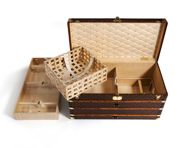 Première étape : la malle de 1906 (ci-dessous en photo). Celle-ci rassemble pour la première fois tous les codes de l'univers Louis Vuitton tels qu'on les reconnaît aujourd'hui. Ses proportions sont parfaites, avec des renforts en bois de hêtre, des coins et des rivets en laiton, une serrure à gorges, et un revêtement en toile Monogramme. L'histoire de la marque Louis Vuitton, elle, débute avec la naissance de son fondateur, en 1821, dans une petite commune jurassienne. Très jeune, Louis apprend à manier les outils auprès de son père menuisier. En 1835, tout juste âgé de quatorze ans, il part tenter sa chance à la capitale et parcourt à pied les 400 kilomètres qui séparent le moulin à eau de Charbouilla de Paris. Deux ans plus tard, il entre comme apprenti chez un layetier-emballeur-malletier, métier qui consistait à emballer les affaires de riches clients qui partaient en voyage, puis réalise des coffres de voyage. Il s'occupera tout particulièrement des toilettes de l'Impératrice Eugénie dès 1852, et fera peu à peu connaître son savoir-faire auprès des clients les plus fortunés.
