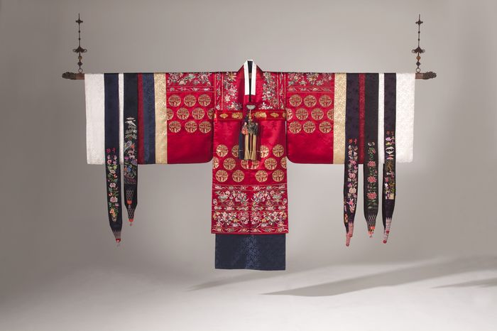 L'artiste In-Sook Son est issue d'une grande famille de brodeuses qui lui ont transmis cette passion. C'est en regardant sa mère broder qu'In-Sook Son décidera de consacrer sa vie à cet art étroitement lié à la parure féminine, dans le but de lui donner un second souffle. Diplômée de la plus réputée des universités coréennes, dans le domaine des arts et du textile, c'est à partir de 1976 qu'elle consacre son temps de loisir à la broderie, en laissant libre cours à sa créativité. Et de revisiter entièrement la garde-robe féminine depuis celle de la petite-fille, dont les vêtements avaient des vertus protectrices, jusqu'à celle de la femme, un somptueux hwarot , une robe de mariage (en photo ci-dessous) portée par les femmes de la cour et des classes supérieures. Celle-ci est présentée au sein de l'exposition et est un des chefs-d'oeuvre de notre artiste. Le hawrot sera adoptée par toute la société à la fin de la période Choson. Richement brodée de motifs de fleurs, d'oiseaux, d'insectes et de motifs auspicieux, tels que le lotus, elle représente une sorte d'apogée dans l'art de la broderie coréenne. Ce vêtement est le vêtement traditionnel coréen le plus décoré. Le wonsam (costume de cour), dont le hwarot dérive, se distingue par ses broderies symboliques et ses larges manches. Et le hwarot d'être une parure royale dont le port était autorisé aux femmes du commun pour leur mariage avec la couleur rouge dominant, symbole de prospérité et des forces vitales. En toute modestie, In-Sook Son a refusé l'appellation de Trésor National vivant qu'on souhaitait lui attribuer, par peur d'être contrainte de devenir une gardienne de la tradition alors qu'elle fait tout pour s'en affranchir et en dépasser le cadre.