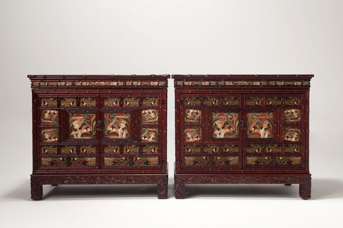 Une des spécificités de l'art de In-Sook Son est la création de meubles dont la marqueterie habituelle a été remplacée par une marqueterie entièrement réalisée en broderies cloisonnées au niveau des parties ajourées des meubles. L'artiste commence par dessiner des meubles en bois foncé, puis travaille en lien étroit avec les sculpteurs sur bois, sur métal mais également avec les maitres vernisseurs. Ce travail collectif est primordial à ses yeux car In-Sook Son considère que lorsqu'on se trouve en face de ces meubles, on ressent la présence de toutes les personnes ayant façonnées ces œuvres.