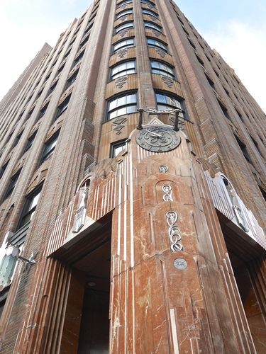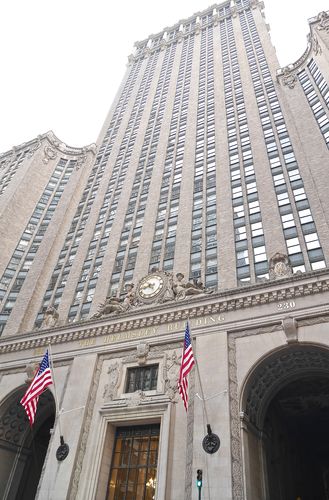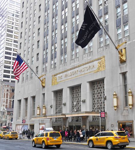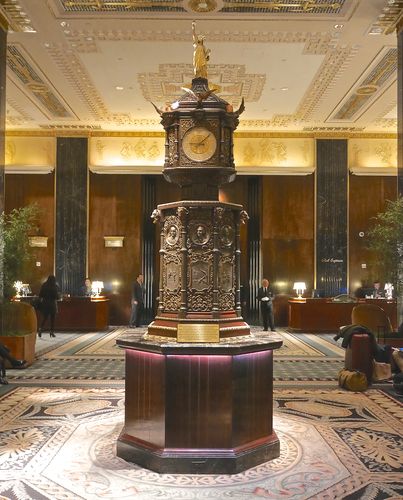 Au 301 Park Avenue, se dresse le Waldorf Astoria Hotel (ci-dessous). Mondialement connu, notamment pour ses expositions artistiques, l'établissement est un gratte-ciel de style art-déco de 47 étages (soit une hauteur de 191 mètres). Désormais la propriété du groupe hôtelier Hilton,, le bâtiment date de 1931, et remplace l'ancien établissement du même nom élevé par la famille Astor sur le site de l'Empire State Building. Ce palace de 1800 chambres fut en son temps le plus grand et le plus luxueux du monde. Tous les présidents américains, mais également bien d'autres célébrités y ont séjourné, comme par exemple le duc et la duchesse de Windsor qui y louaient habituellement une suite à l'année. En 1945, un banquet y fut donné en l'honneur de Charles de Gaulle et de Winston Churchill. Le grand chic était alors d'arriver à l'hôtel en train privé, comme Franklin D.Roosevelt, par une voie souterraine reliée à Grand Central, toute proche, et aujourd'hui désaffectée. Un ascenseur menait directement les hôtes de marque dans leur suite de la Waldorf Tower. Autrefois, l'entrée sur Park Avenue s'appelait the Ladies Lobby (Entrée des dames). De nos jours, l'hôtel est toujours un palace disposant de services et de suites de premier ordre. Et une magnifique pendule en photo ci-dessous (qui sonne régulièrement), trône au centre du hall de réception. La Roue de la vie, une mosaïque du Français Louis Rigal (troisième photo), qui date de 1931, représente les drames de l'humanité et orne le hall d'entrée. Au fond du même hall, se trouve toujours le mythique piano sur lequel jouait jadis Cole Porter.