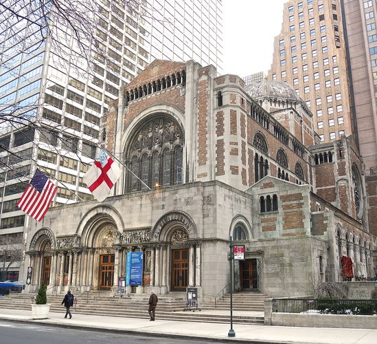 Je redescend à présent vers la 50è rue puis tourne à droite pour rejoindre Park Avenue. Et de passer à côté de l'église Saint Barthélémy (ci-dessous), au numéro 109 de la 50è rue Est / Park Avenue. Cette église, fondée en janvier 1835 dispose d'un plan en croix grecque. Son porche néoroman et sa coupole de briques vernissées donnent beaucoup de charme à ce lieu de culte de style byzantin, tout en tranchant avec l'uniformité des ensembles architecturaux voisins. Malheureusement, le prix du terrain étant ce qu'il est à Manhattan, l'existence même de cette église est menacée par l'extension des immeubles de bureaux. Désormais, le café restaurant Inside Park at St Barth's (anciennement Cafe Terrace at St Barth's) offre une pause aux visiteurs de passage.