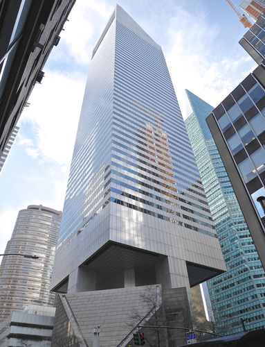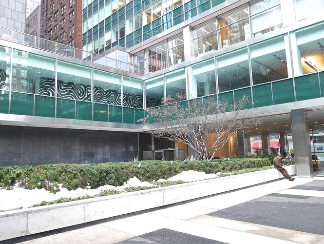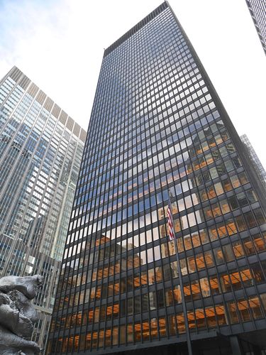 Juste en face, au numéro 375 de Park Avenue, se dresse le gratte-ciel Seagram Building (ci-dessous). C'est l'architecte allemand Ludwig Mies van der Rohe qui le réalisa, en collaboration avec l'architecte américain Philip Johnson, entre 1954 et 1958. C'est d'ailleurs l'unique construction new-yorkaise de cet architecte allemand, construction classée monument historique depuis le 24 février 2006. Implanté un peu en retrait de Park Avenue, le Seagram Building se présente comme un parallélépipède de couleur bronze posé sur sa place en granit. Le bâtiment, comme la majorité des grands immeubles de cette époque, dispose d'une ossature en béton armé sur laquelle est suspendue une façade-rideau. Mies désirait quant à lui une ossature métallique apparente mais la législation américaine exigeait que toutes les structures soient ignifugées. Des panneaux non structurels de couleur bronze furent donc dressés le long des façades afin de « camoufler » l'ossature. 1450 tonnes de bronze furent nécessaires pour cet habillage. Mies aimait les détails : il détestait l'irrégularité des stores plus ou moins baissés, et utilisa donc des stores à trois positions (ouvert, mi-ouvert et fermé). La somptueuse décoration du gratte-ciel en fit à l'époque le bâtiment le plus cher du monde, à cause de l'inclusion de bronze, travertin et de marbre. Un restaurant, le Four Seasons Restaurant, se trouve à l'intérieur du gratte-ciel et a conservé depuis l'ouverture en 1959. A l'époque, une série de tableaux avait été commandée à Mark Rothko un an avant. Dans son délire, le peintre avait promis de faire quelque chose qui ruine l'appétit de chaque fils de pute qui mangera jamais dans cette pièce. Il abandonnera toutefois le projet mais gardera les toiles qui sont désormais dispersées entre la Tate Gallery, la National Gallery of Art et le Kawakura Memorial Museum (Japon).Une petite anecdote à propos du Seagram Building : sur la façade donnant sur Lexington Avenue, se trouve la grille d'aération du métro qui fit s'envoler la robe blanche de Marilyn Monroe dans le film « Sept ans de réflexion » (en 1955).