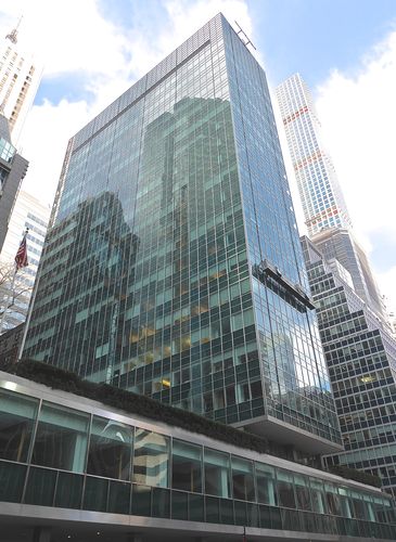Parti un peu en retrait de Park Avenue, je regagne maintenant celle-ci en empruntant la 53è rue Est vers l'ouest, jusqu'à me trouver bientôt nez à nez avec la Lever House (ci-dessous). Situé au 390 Park Avenue, cet immeuble est le premier bâtiment à murs-rideaux qui fut construit à New York. Cette glass box bleu-vert, en forme de L (pour Lever) semble flotter au-dessus de la célèbre avenue. Sa construction prit place de 1951 à 1952 afin de devenir le siège de la compagnie britannique Lever Brothers (entreprise spécialisée dans un nouveau procédé de fabrication de savon, qui fusionnera plus tard avec Margarine Unie, pour former le groupe actuel Unilever). Son revêtement de verre bleu-vert résistant à la chaleur, et son acier inoxydable, garnissent certains murs complètement fermés, sans fenêtres, afin de baisser les coûts de maintenance et d'air climatisé. Sa légèreté et ses lignes épurées sont censées évoquer celles des bulles de savon (qui a fait le succès de la firme) et la place en contrebas de la tour (deuxième photo) ainsi que l'entrée sont, depuis la dernière rénovation, utilisées comme galerie d'art pour la collection d'oeuvres de Lever House. Le bâtiment fut classé monument historique en 1983, ce qui ne l'empêchera pas d'échapper de peu à la destruction.
