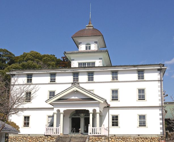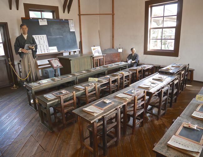 Iwata abrite une autre curiosité : l'ancienne école élémentaire de la ville (ci-dessous). L'école de Mitsuke (c'est son nom!) fut alors le premier établissement scolaire de ce genre à cette époque. C'est Ito Heiemon, charpentier originaire de Nagoya et spécialisé dans la construction de sanctuaires et de temples, qui érigea le bâtiment. La construction débuta en 1874 et l'école ouvrit ses portes un an plus tard. Les pierres servant aux fondations de l'ensemble provinrent de l'ancien château de Yokosuka (région d'Enshu), et constituèrent ainsi une dalle de 22 mètres sur 9 environ. Le bâtiment est formé de deux étages et est bâti en bois et dans le style occidental. L'entrée comporte quant à elle des colonnes de style grec. Le plafond du second étage sera refait en 1883, ce qui donne l'impression de l'existence de trois étages (alors qu'il n'y en a que deux). C'est sous la période Meiji, plus exactement en 1872 que le Japon mettra sur pied son système éducatif moderne. Jusqu'alors, les petits écoliers japonais apprenaient à lire et à écrire à l'école élémentaire Terakoya. Et la nouvelle école de Mitsuke de prendre le relais à partir de 1875. Elle reste à ce jour la plus ancienne école élémentaire du pays. L'école ne connut pas tout de suite le succès escompté car peu d'enfants se rendaient alors à l'école, car 60% d'entre eux travaillaient pour aider leurs familles. Il fut donc décidé de faire porter à chaque écolier de l'école un badge en bois attestant de sa présence scolaire. L'objet, ainsi fixé à la taille de chaque enfant, était supposé encourager les autres enfants à venir, eux aussi, assister aux cours. L'enfant débutait son apprentissage à l'âge de six ans, et pour une durée de quatre ans dans le cours élémentaire (et quatre années supplémentaires pour suivre le cours supérieur). La majorité des élèves arrêtaient toutefois leurs études à l'issue des quatre première années et partaient travailler pour leurs familles. Le système de promotion, lui, comportait huit niveaux, chaque niveau requérant six mois d'études. Les élèves talentueux étaient invités à passer un examen spécial qui pouvait les faire accéder au grade supérieur en moins de six mois. Le bâtiment abritera donc l'école élémentaire jusqu'en 1922, puis deviendra un centre de formation pour professeurs, puis une école de couture pour filles, avant d'être utilisé comme hôpital militaire durant la Seconde guerre mondiale. A l'issue de la guerre, l'endroit restera un hôpital jusqu'en 1954, date à laquelle le bâtiment accueillera le musée folklorique d'Iwata. En 1992, le lieu recevra à nouveau le nom d'école de Mitsuke et expose désormais des objets scolaires qui firent autrefois les beaux jours de l'établissement.