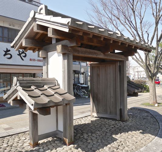 Je me promène sur une portion de cette fameuse route Tokaido, qui traverse le centre-ville de Toyohashi, pour atteindre la large rivière Toyogawa. Il ne reste guère plus de traces du passé si ce n'est la marque de l'endroit où se dressaient jadis les portes Est (ci-dessous) et Ouest de la ville-étape de Yoshida (depuis incluse dans la ville de Toyohashi). Plus de honjin non plus, mais il reste tout de même la matérialisation des restes d'une des deux honjins que comptait alors Yoshida dans les années 1800. Une veilleuse en pierre se dresse enfin face à l'ancienne porte Est, au carrefour Higashi haccho.