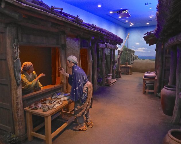 A vrai dire, l'histoire débute bien avant, lorsque l'endroit n'était alors que le petite village de Kurube, il y a 2000 ans. Les gens vivront dans des maisons primitives faites en bois jusqu'au XIII ème siècle. Peu larges (4,7 mètres), ces demeures étaient relativement hautes (5,4 mètres) et étaient aménagées afin de laisser s'échapper la fumée par le toit. Quatorzième subdivision traditionnelle de l'histoire du Japon, la période Yayoi commence vers 400 ans avant J.C pour se terminer vers 250 ans après J.C. Le pays était alors constitué de centaines de communautés tribales, qui vivaient de riz, de légumes crus et de poissons servis sur des plateaux de bois et de bambous. Les populations auront des relations de maitres à vassaux, et l'on sait qu'il existait des collectes de taxes (déjà!), des greniers et des marchés provinciaux. On sait aussi que les gens frappaient dans leurs mains pendant les cultes, qu'ils se battaient dans de violentes luttes de successions, qu'ils construisaient des tombes sous la forme de tumulus et qu'ils pleuraient leurs morts. Le petite village de Kurube (ci-dessous), lui, connaitra des avancées sociales et agricoles au fur et à mesure, et la population, probablement issue d'un mélange de gens venus du nord de Kyushu avec des habitants de la civilisation Jomon, d'augmenter peu à peu et d'évoluer. On tissait des draps, on vivait dans des villages de fermiers et on cultivait le riz de manière similaire au centre et au sud de la Chine voisine. L'irrigation des champs existait déjà, la riziculture engendrant de profondes modifications du développement des villages. Et une hiérarchisation de se mettre en place avec la sédentarisation des populations, aboutissant à la création de petites unités économiques.