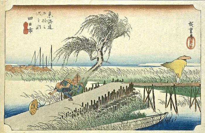 Longtemps plus tard, Yokkaichi allait devenir l'une des stations postales de la route du Tokaido instaurée par Ieyasu Tokugawa. Et la cité d'aligner ses boutiques le long des rues (ci-dessous) qui convergeaient souvent vers la baie d'Ise, anse naturelle le long de la côte nippone dans laquelle se jette le fleuve Kiso. On peut y admirer les rochers mariés de Meoto qui forment l'un des sanctuaires shinto les plus importants du pays, Izinagi (le mâle) et Izanami (la femelle), dont l'union est symbolisée par une lourde corde en paille de riz appelée shimenawa. C'est de l'oeil gauche d'Izanagi que serait née Amaretsu, principale divinité shinto.