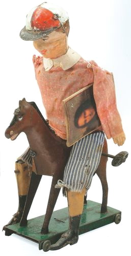 Né de famille modeste, en 1849, Fernand Martin, lui, bricolera des arbalètes à ressort. Les fastueux modèles de Monsieur de Vaucanson n'avaient-ils pas fait la joie des cabinets royaux au XVIII ème siècle ? D'autres produits plus courants sont progressivement lancés par notre inventeur, avec l'essor des grands magasins durant le XIX ème siècle. Et les clients de tomber rapidement amoureux de ces petites figurines vêtues de couleurs vives mimant en vitrine des gestes du quotidien. Fernand Martin a alors pour ambition de mettre au point un jouet mécanique bon marché qui ne coutera que...29 sous. Il dépose un brevet en 1878, pour un poisson nageur, puis, pour un bateau de pêcheur. L'originalité et la poésie qui se dégagent de ces premiers modèles en font un succès immédiat. Installé au 88, boulevard de Ménilmontant en 1900, notre homme produira près de 800 000 jouets par an. Une centaine d'ouvriers laminent, découpent et estampent alors l'alliage ferreux, avant d'installer l'ingénieux mécanisme à ressort mu par une clé qui donne vie à la figurine. Peints, habillés et bientôt prêts à être écoulés, les jouets sont distribués aux camelots dans toute la France. De son côté, Fernand Martin suit attentivement l'actualité et adapte sa production au gré des circonstances : il créera ainsi un rutilant petit soldat, le Vaillant Boer suite à la guerre d'Afrique du sud, et n'hésitera pas à affubler l'intrépide jockey (ci-dessus en photo) d'une reproduction du tableau de la Joconde à la suite du vol de la Joconde. Rachetée par la société des automates en 1919, l'année du décès de Fernand Martin, l'entreprise s'éteindra en 1965. Entre temps, notre inventeur aura fait don d'une centaine de ses modèles au musée des arts et métiers, des modèles d'ailleurs toujours prisés des collectionneurs.