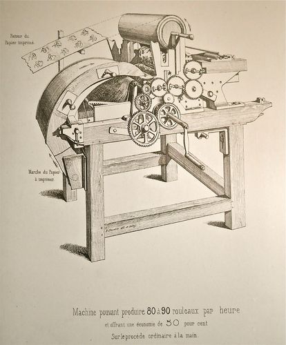 Xavier Mader avait été quant à lui recruté par la manufacture Joseph Dufour en 1808, grâce à ses talents de dessinateur. Son répertoire s'étendait alors à des thèmes mythologiques aux figures tirées du répertoire théâtral. En 1851, sa famille hérite du Pavillon de l'Ermitage, folie de l'Est parisien d'époque Régence. Et les deux fils de Xavier Mader, fabricants et éditeurs de papiers peints, de faire fructifier l'affaire de leur père née en 1825, au 176 rue de Charonne. En 1851, le fond sera cédé à un employé, Jules Desfossé, originaire de l'une des plus florissantes enseignes du milieu du XIX ème siècle, la maison Desfossé & Karth. La production manuelle à la planche de bois est alors remplacée par la fabrication au cylindre gravé, entrainé par une machine continue (ci-dessus). Le papier peint connait alors un grand succès, tout particulièrement le papier à tenture. Et L'entreprise de produire couramment motifs à corniches, camées, marbres et lambris qui sont ensuite vendus à des marchands spécialisés dans tout l'hexagone.