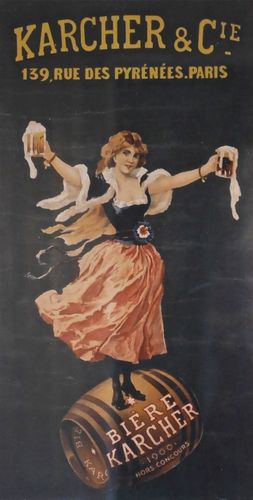 La brasserie Karcher (ci-dessus), elle, naquit d'une passion familiale : son fondateur, Henri Karcher vivait au sein d'une famille de brasseurs alsacienne installée en région lyonnaise.Il fondera sa brasserie en 1891, par le rachat de la brasserie Heusch, au 88 rue de Bagnolet. Depuis les années 1850, ce domaine d'activité connaissait deux innovations de taille, l'utilisation de la technique de fermentation basse (à froid) et la mise en pratique des travaux de Pasteur (pasteurisation de la bière). Et Henri Karcher d'innover en adoptant de nouveaux procédés industriels de fabrication, entrainant ainsi une croissance rapide de son affaire. De nouveaux bâtiments sont ainsi érigés au 139 de la rue des Pyrénées. Plusieurs dépôts de bière sont aussi créés en province et on assiste à une diversification des activités (ouverture de débits de boisson, première taverne inaugurée en 1897, à l'angle du boulevard de Belleville et de la rue du Faubourg du Temple...). En 1900, la brasserie Karcher participera aussi à l'Exposition universelle et recevra pour l'occasion de nombreuses distinctions. L'entreprise produit alors entre 120 000 et 130 000 hectolitres de bière, et est la plus grande brasserie parmi les quinze que compte la capitale. Au milieu des années 1920, Henri Karcher cède son entreprise.Puis, le secteur brassicole déclinera peu de temps après et la brasserie Karcher sera intégrée à la Société financière de l'Union des Brasseries. Après 1945, l'entreprise fera encore partie des cinq brasseries toujours en activité à Paris et le slogan maison, « Avec Karcher, on récupère ! »,sera un succès. Le début des années 1950, une nouvelle salle de brassage s'installe rue des Pyrénées. Et en 1964, l'Union des Brasseries fusionnera avec la société des Nouvelles Brasseries, installée à Drancy, avant qu'Heiheken ne rachète cette dernière quelques années plus tard.