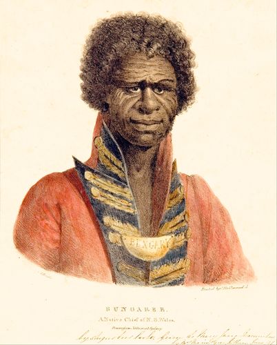 Autre britannique arrivé à bord de la First Fleet, l'officer Watkin Tench est de nos jours connu pour ses récits sur la fondation de Sydney. Il mènera plusieurs expéditions exploratoires et découvrira la Nepean River. Il s'intéressera enfin aux Aborigènes qu'il traitera en amis. L'installation des Européens sur le continent aura des effets désastreux sur la santé des Aborigènes, ces derniers étant rapidement contaminés par la rougeole, la variole ou la varicelle, maladies contre lesquelles ces tribus ne disposaient d'aucun défense immunitaire. Rajoutons à cela les effets de l'alcool et les effets de l'expansion coloniale, et on comprendra pourquoi la population aborigène sera décimée en l'espace de quelques années seulement. Malgré tout, le gouverneur Arthur Phillip avait pourtant été chargé d'établir avec les populations locales les meilleurs rapports, en s'attachant la confiance de certains Aborigènes comme, par exemple, Bennelong. Aborigène d'Eora (région de Port Jackson), Bennelong sera d'abord enlevé par les colons afin de servir de premier intermédiaire entre occupants britanniques et Aborigènes. Il sera le premier Aborigène à écrire en anglais et se rendra même avec le premier gouverneur Arthur Phillip en Angleterre, en 1792. Il sera à ce titre l'un des premiers Aborigènes à fouler le sol européen. Bungaree (en photo ci-dessous), lui aussi Aborigène, sera aussi médiateur : connu comme explorateur et diplomate, il s'illustrera aussi en tant qu'artiste dans les territoires coloniaux de Sydney, en se donnant en spectacle vêtu d'uniformes militaires marins de toutes sortes. Ses tenues originales, sa notoriété au sein de la société coloniale, ses dons humoristiques et son art mimique, tout particulièrement pour imiter les gouverneurs coloniaux, feront de lui un sujet populaire pour bien des portraitistes. Bungaree fera ses débuts en 1798 lorsqu'il accompagnera Matthew Flinders dans une enquête côtière, en tant qu'interprète, guide et négociateur avec les groupes autochtones locaux. Flinders, cartographe de la première carte complète d'Australie, fera appel à ses services à plusieurs reprises, trouvant l'homme digne et courageux. Et Bungaree d'être couronné en 1815 comme chef de la tribu de Bay Broken, par le gouverneur Lachlan Macquarie. Il recevra pour l'occasion 15 acres de terres à Georges's Head. On le connaissait sous le nom de Roi de Port Jackson, ou Roi des Noirs. Il passera le restant de sa vie à accueillir les nouveaux arrivants dans la colonie, à enseigner le lancer de boomerang et à faire la mendicité.