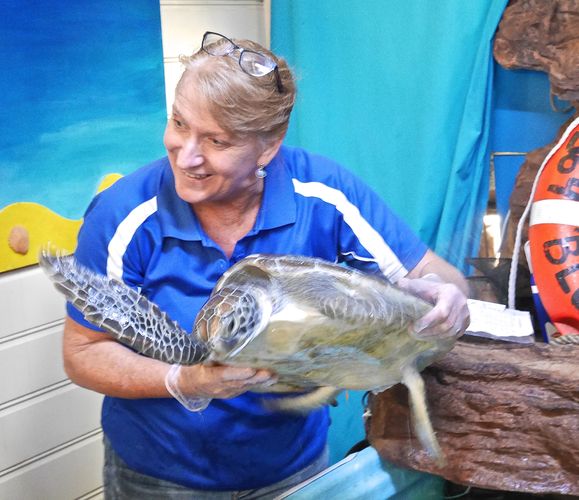On m'informe que le centre abrite actuellement une tortue verte de mer qui a récemment subi une intervention chirurgicale afin de lui retirer une tumeur cancéreuse à la gorge. L'opération s'est bien passée et notre tortue a repris des forces. Pour la photographie, Jan (en photo ci-dessus) sortira un instant la tortue de l'eau. Celle-ci battra des nageoires avec une vigueur inégalée. En voilà une qui devrait bientôt rejoindre son milieu naturel....Rappelons que la tortue verte de mer ne mesure que 5 centimètres de long à sa naissance mais ...jusqu'à 1,5 mètre à l'âge adulte (pour un poids supérieur à 300 kg). Elle est en effet la plus grande espèce de tortues marines existante. Sa carapace est large et douce à la fois, de couleur brun olive, tandis que sa face intérieure laisse apparaître une couleur jaune. Curieusement, sa tête ne peut pas se rétracter à l'intérieur de son corps, mais notre tortue a bien d'autres qualités comme, par exemple, sa vitesse de déplacement qui peut dépasser les 56 km/heure, grâce à ses larges nageoires. L'animal peut aussi s'abstenir de respirer pendant des heures, plus facilement, il est vrai, lorsqu'elle se trouve en eau froide. Manifestement, cette espèce de tortue est faite pour la vie marine, et elle se déplace très difficilement à terre. Il le faut pourtant, lorsqu'elle rejoint tous les deux à quatre ans sa plage native pour y déposer ses œufs (entre 100 et 200). Pour cela, notre tortue femelle est capable de parcourir des distances impressionnantes pour mener à bien sa mission.